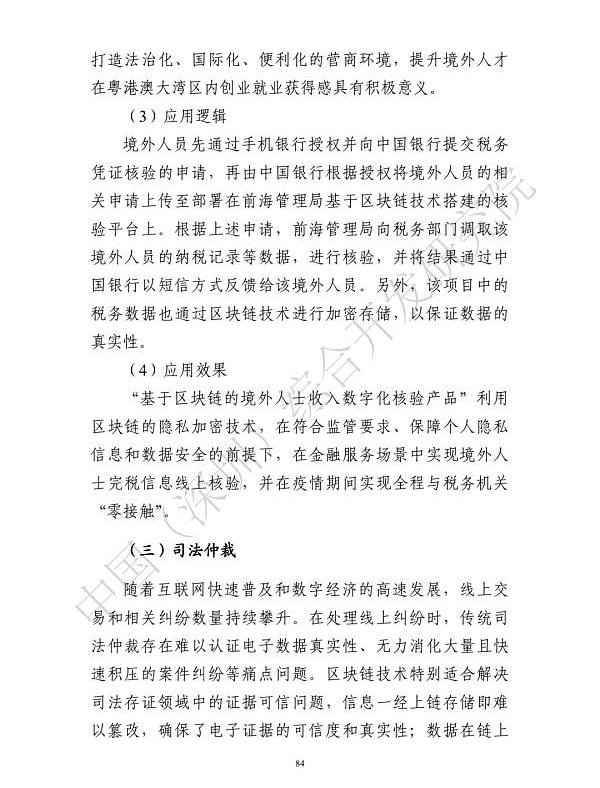 作為一大亮點,報告引用了大量基于FISCOBCOS,并在粵港澳大灣區落地的應用案例:在數字經濟發展方面,“粵澳跨境數據驗證平臺”、“灣區金融科技人才鏈”、“珠三角征信鏈”、“深證金融區塊鏈平臺CapitalBCOS”等案例入選;在數字社會建設方面,“澳門智慧城市建設之證書電子化”、“粵澳健康碼跨境互認”、“騰訊99公益日”等案例入選;在區塊鏈推動數字政府建設方面,“網貸機構良性退出投票平臺”、“區塊鏈司法存證仲裁服務平臺”、“深圳水務集團工地安全管理系統”、“智慧司法區塊鏈留痕系統”等案例入選。