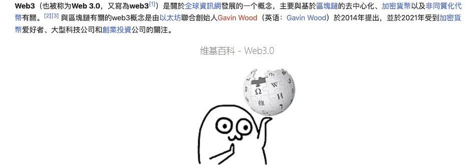 維基百科上是這樣來定義的,Web3.0是關于全球資訊網發展的一個概念,主要基于區塊鏈的去中心化、加密貨幣以及非同質化代幣有關。
