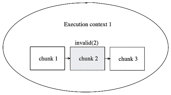 假設我們將這條區塊鏈放到 “執行環境 1 ” 中翻譯,數據塊 1 代表有效數據,數據塊 2 代表無效數據。“執行環境 1” 可以在其它地方,如 Layer 2,上運行。