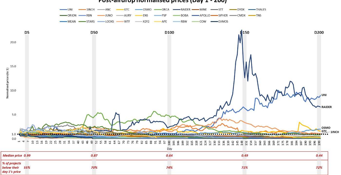 根據歷史中值數據,在200天的時間范圍內,只有兩天的空投中值表現優于發布價格——第4天和第18天。