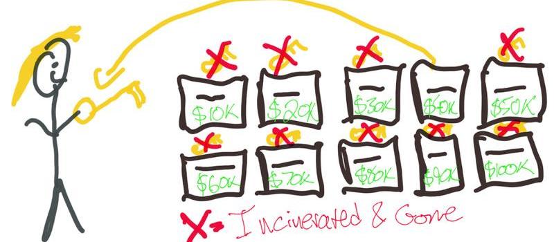中介設置了10個信箱,分別標記了從1萬美元到10萬美元的10個整數,每個信箱上都有一個鑰匙和一個插槽。中介將這10個信箱放進房間的同時,毀掉了其中9個信箱的鑰匙,然后只拿走了標有4萬美元信箱的鑰匙。?
