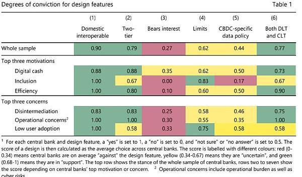中央銀行的調查回復和背景文件闡明了六個主要設計特征,這些特征可以幫助實現央行數字貨幣的發行動機,同時減輕隨之而來的擔憂。在表1中,我們報告了中央銀行對這些設計特征的立場。