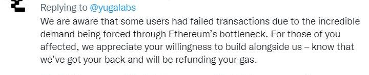 YugaLabs表示將退還用戶因交易失敗而花費的GasFee