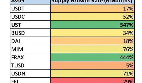 這意味著UST在過去6個月里的增長速度比10個被選中的穩定幣的平均增長速度快了4.4倍,比整個穩定幣行業的增長速度快了14倍。