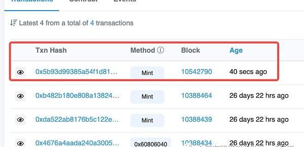 我們在測試網試一下使用這種方式和合約直接進行交互的流程,我找到了之前部署的一套合約,然后點擊進入已經完成的mint交易詳情中。