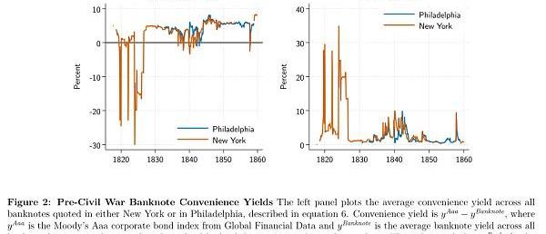 穩定幣的增長引發了一個問題,即私人代理如何才能賺錢。我們研究了兩種類型的債務,因為它們的發行人試圖讓它們賺錢:內戰前的私人鈔票和現代數字穩定幣。新的私人生產貨幣的誕生需要兩個要素:缺少替代品,以及一個使錢能以面值被接受且沒有問題的設計。我們發現,技術進步和聲譽形成推動私人生產的貨幣向正的便利收益率發展——首先是私人鈔票,然后是穩定幣。