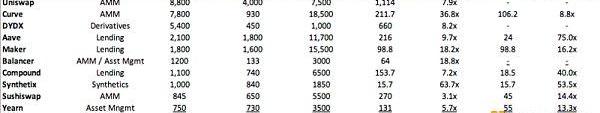 DeFi網絡價值和協議收入-目前排名前10位的DeFi協議的FD網絡總價值為310億美元。據我估計,他們在鏈上產生了29億美元的年化收入,其中3.65億美元左右作為抵押紅利流入代幣持有者或間接燃燒。是的,大部分收入確實流向了流動性提供者。但是10.5倍的FD價值/收入倍數和32.7倍的流通價值/代幣持有者收益倍數并不昂貴,而且對于同比增長20倍的東西來說,它被嚴重低估了。
