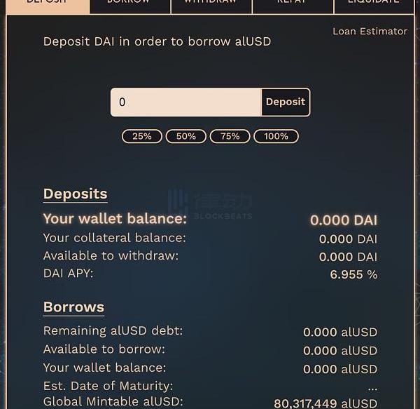 隨后我們可以借出Alchemix平臺的StablecoinalUSD,最大質押借款比為50%。如紅框中的文字提示,用戶存款所獲得的APY會自動用于還款。