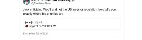 我看到Jack既否認了Web3的現實,又把他的Web2思維投射到了整個行業。可悲的是,世界上任何時候都有一種基本的反加密情緒,像Jack這樣的領導人可以鼓動足夠的謾罵,以使批評合法化。