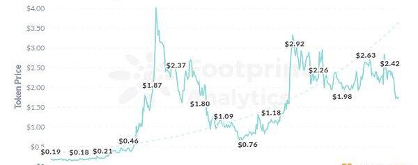 平臺原生治理代幣為AUDIO,可以用于抵押、鎖倉以及社區治理,已在幣安UniSwap、FTX上線。FootprintAnalytics數據顯示其價格在今年3月28日達到峰值4.03美元。值得一提的是,8月Audius宣布服務集成在TikTok上,價格從1.61美元漲至3.33美元,增幅106%。