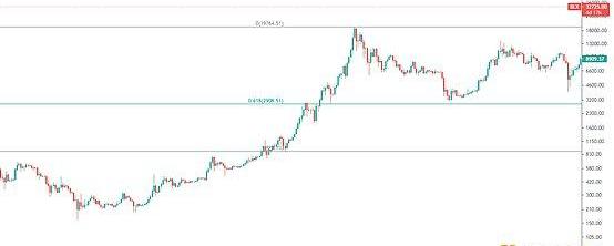 再看下17年牛市走勢,同樣以這一輪牛市主升浪啟動前的最后一波調整的低點,以及本輪牛市的終極大頂測算,可以發現中間BTC同樣在突破0.618壓制線后也出現了大力回踩的過程,價格在此確認支撐有效然后繼續向上攀升,后面迎來了本輪牛市后半段的瘋狂期,和13年牛市進程相比,本輪牛市調整時間短速度快,強勢洗盤后價格快速回升,沒有給交易者太多低吸時間。