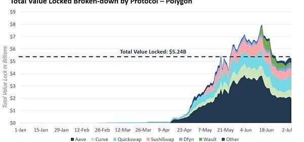 上圖:Polygon上的各大DeFi協議的TVL美元價值變化情況(單位:10億美元),數據截止2021年7月5日。