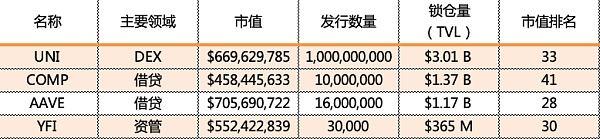 我們可以看到YFI、UNI、COMP和AAVE等頭部DeFi項目都發了自己的治理代幣。其中COMP是最早帶出來流動性挖礦概念的;UNI是本輪DeFi崛起的核心;AAVE具有合規背景;而YFI更是單一價格超越了BTC。這些治理代幣從市值上來講已經沖進了前50。