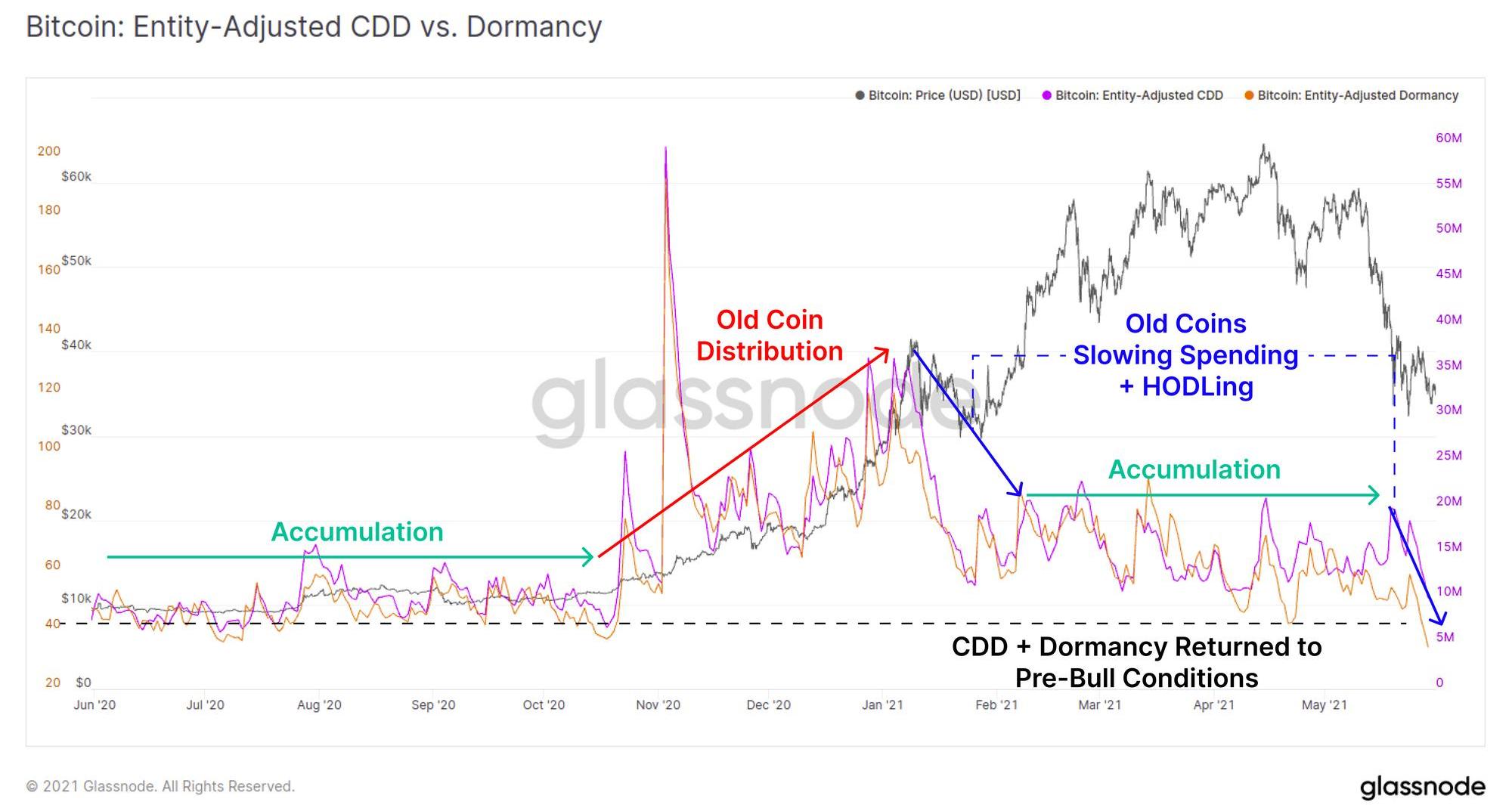 另外兩個壽命指標“Coin-DaysDestroyed(CDD)”和“Dormancy”也代表了相似的涵義。盡管價格從峰值下跌50%,舊幣似乎仍處于“休眠”狀態。