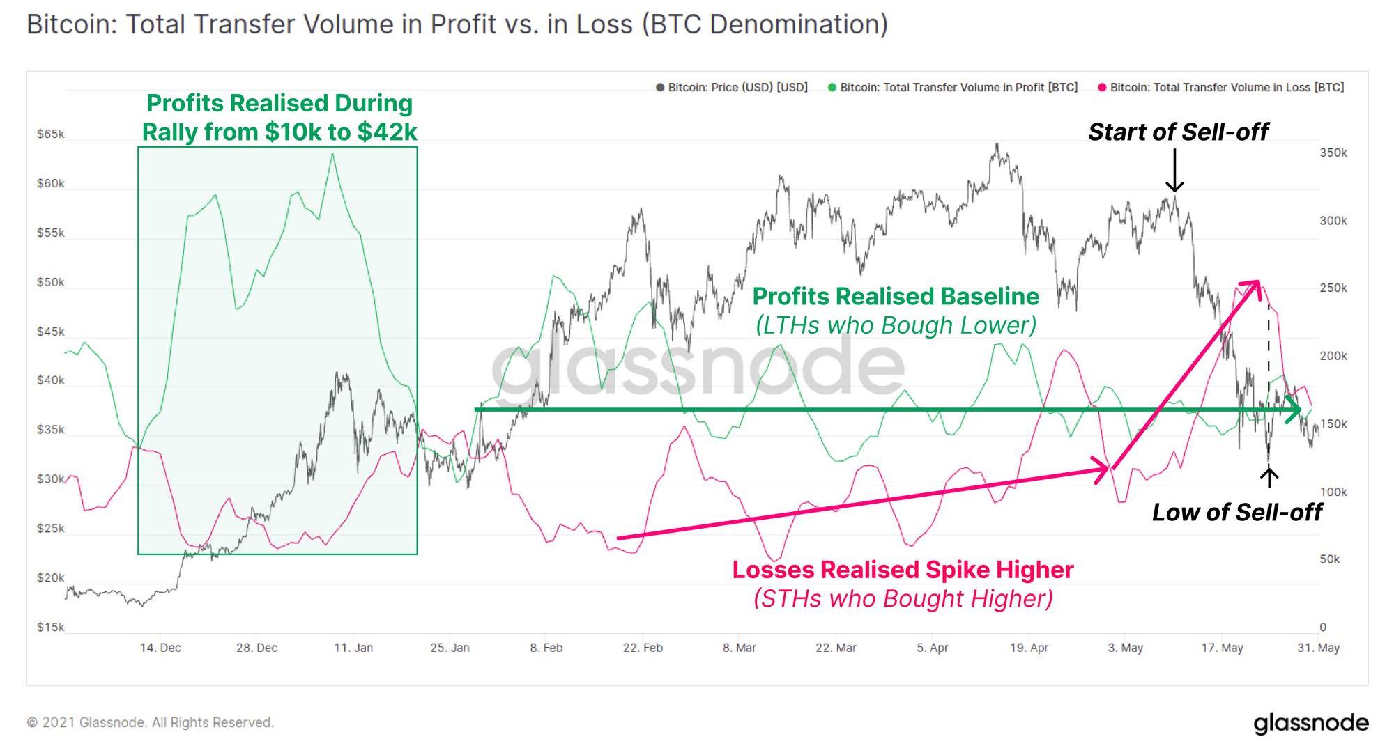 我們還可以查看分別處于盈利狀態和虧損狀態的鏈上比特幣轉移量。下圖中的多個觀察結果證實了,大量的支出和拋售壓力是由短期持幣者所驅動的: