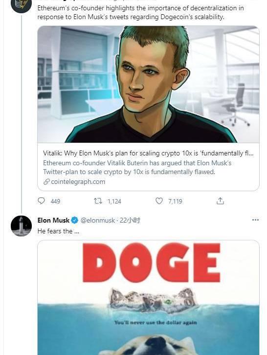 很快,馬斯克對此做出回應,但只有一句話:「VitalikButerin害怕狗狗幣。」