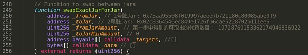 swapExactJarForJar()函數使用CurveProxyLogic智能合約地址和注入參數來執行指定函數