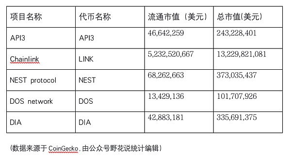 目前與API3同處預言機賽道的項目有Chinalink、NEST protocol、DOS network、和DIA等等,其中Chainlink是龍頭。它們當前的市值如下: