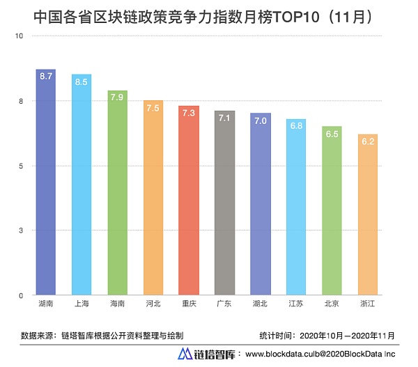 鏈塔智庫從公開資料搜集了11月份各省的區塊鏈相關政策,并進行了整理匯總,發布了“中國各省區塊鏈政策競爭力指數TOP10”月榜(11月)。同時,鏈塔智庫會持續跟進國內各省發布的區塊鏈政策,并在12月份發布“2020中國區塊鏈產業政策年度榜單”,敬請關注。