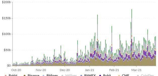 比特幣期貨的統計范圍包括BitMEX、幣安、Bitfinex、Bakkt、Bybit、CME、Deribit、FTX、火幣和OKEx。以太坊期貨的統計范圍包括BitMEX、幣安、Bitfinex、Bybit、CME、Deribit、FTX、火幣和OKEx。