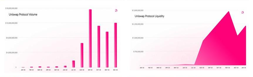 DEX最典型的代表是Uniswap,一個擁有極簡代碼的社區項目,不到兩年時間就成長為與CEX匹敵的巨頭,從各類統計數據來看,Uniswap已經進入加密資產交所排名的前5。根據Uniswap官網博客公布的數據,2020年平臺交易量580億美元,比2019年的3.9億刀增長了150倍,至年底已20億美元的流動性,比年初1200萬美元增長了170倍。特別值得一提,在2020年9月,該協議的每周交易量短暫超過了Coinbase。而這些成績僅僅用了兩年左右的時間,來自加密資產社區的力量可見一斑。