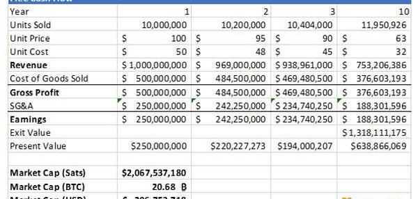 創建了兩個DCF模型。一種模型是在價格由美元本位的投資者驅動的世界中分析公司,另一種模型是在價格由BTC本位的投資者驅動的世界中分析公司。