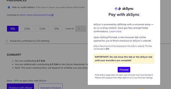 下一個頁面是付款,有兩種付款方式可以選,一種是右邊的標準付款,一種是左邊的使用zkSync付款。用標準付款,就是正常的以太坊網絡付款流程,總共需要支付兩次,一次是批準網絡扣款,大概收費5美金的GAS費,第二次是捐贈轉賬,除了1DAI的捐款,還需要支付約14美金的GAS費,兩次GAS費都使用ETH付款,GAS費隨以太坊價格跟網絡擁堵狀態略有變化。