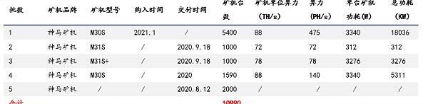2021年1月,公司繼續購買6440臺CanaanAvalonMiner1246,到2021年底全部部署后,算力將增加到估計的1229PH/s。公司新目標是到2021年底達到2000PH/s。