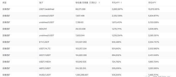 當用戶參與交易挖礦時,用戶獲得的是MDEX的治理代幣MDX獎勵,其獎勵的數量會根據交易量而定。下圖是目前MDEX上交易挖礦的APY,目前看其收益非常高,這也是推動其交易量上漲的重要原因。
