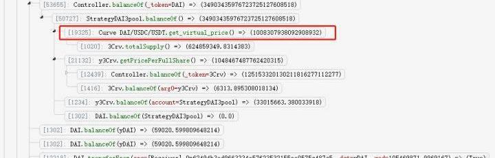 上圖紅框顯示,在進行鑄幣時,需要讀取合約中的DAI余量,但因為策略合約中的DAI已經抵押至curve合約進行盈利,所以要計算DAI代幣的量,只能通過價值換算,計算出所持有的Curve代幣能夠兌換的DAI的量。