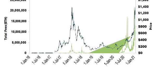 我們可以將以太坊網絡上收取的每日交易費用總額作為衡量需求的標準,如下圖所示。由于ETH是用來支付這些費用的商品,高交易費推高對ETH的需求,好比旅游熱會推高對汽油的需求。值得注意的是,2021年一月的總交易費用差不多達到2018年一月高峰期交易費用的5倍。而ETH的價格也幾乎接近于2018年的峰值。