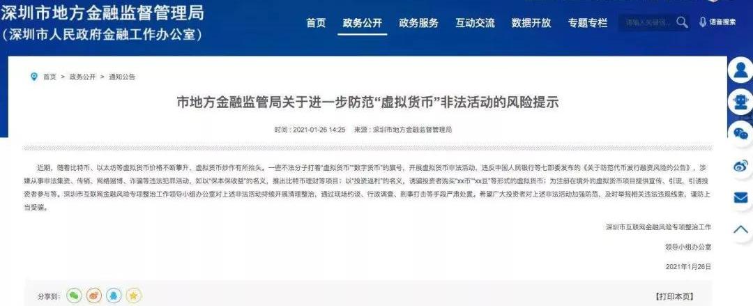 同時,國內的相關監管防范也正在升級。發稿當日,深圳市地方金融監管局又發風險提示,打擊“虛擬貨幣炒作”之風,對其非法活動進行清理整治。