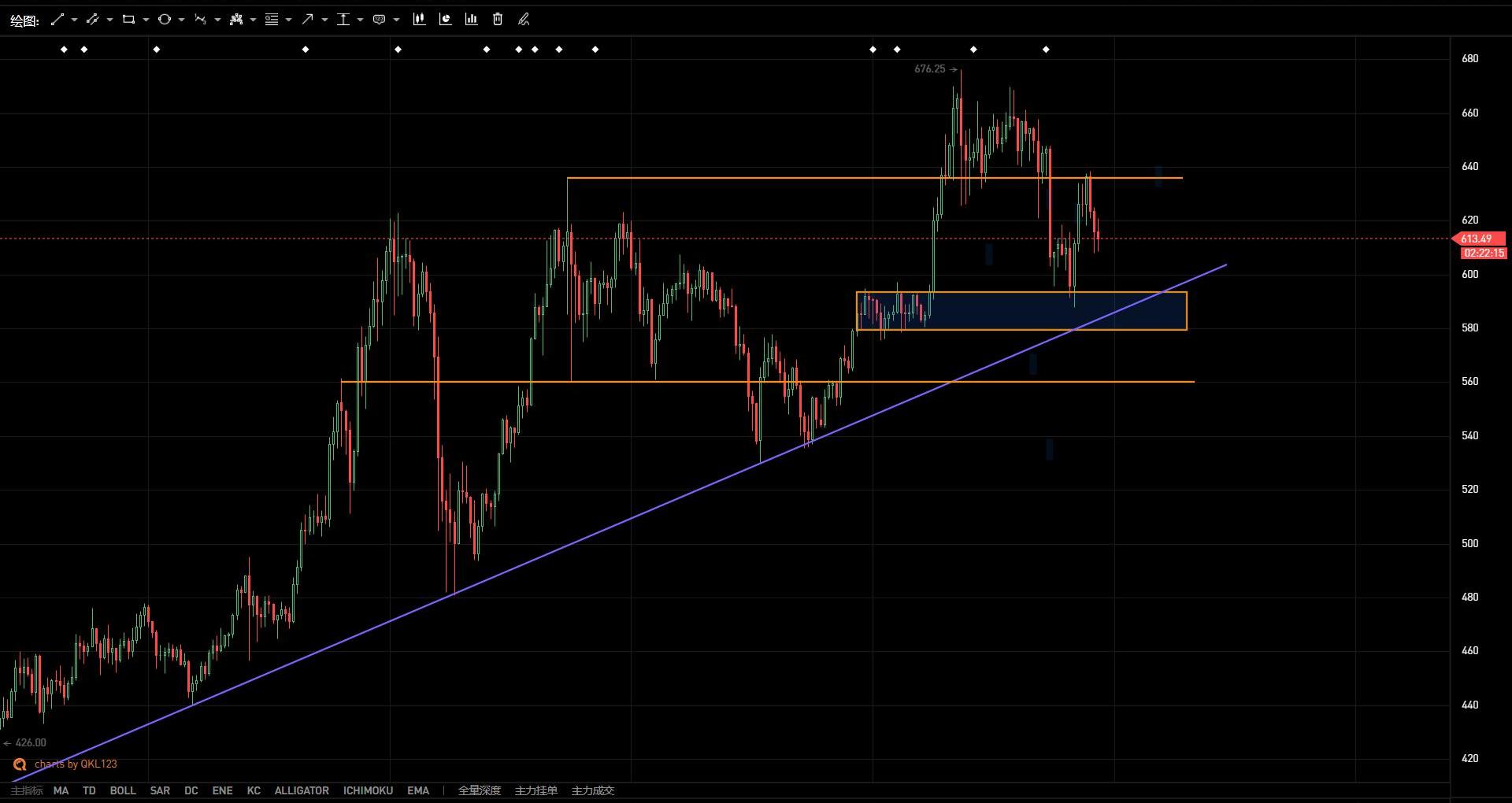 如圖所示,以太坊前日晚間比特幣下跌,以太坊也隨之被帶崩,跌破上期報告中所說636關鍵關鍵位置,支撐轉壓力,構成關鍵壓力位;后下探至600一線止跌并進行二探,和比特幣走勢結構相似,但隨比特幣反彈勢能較弱,后續走向仍然參考比特幣。目前以太坊受制于636關鍵阻力,若突破則看前高670附近;下方籌碼密集區578-597構成支撐區,中期支撐關注560一線。