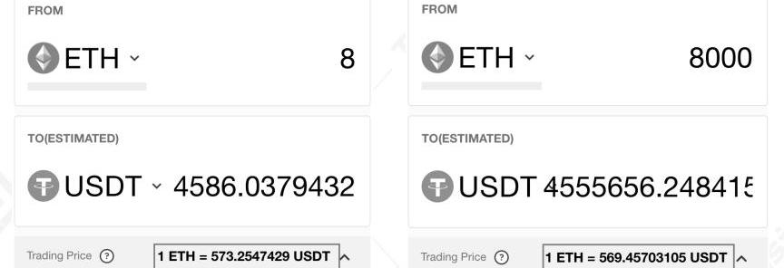 此外,DODO將流動性聚集在市價附近以降低滑點,因此,隨著交易額的增大,將出現滑點激增的情況。和Uniswap相比,DODO更適用于小額交易。