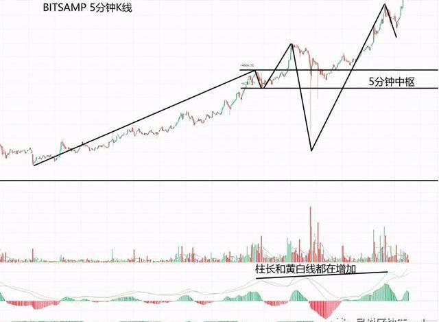 30分鐘K線顯示:形成30分鐘中樞并強勢突破,以現在走出來的MACD柱長判斷,沒有形成背馳,不會反轉。