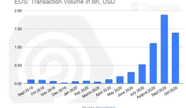 EOS在2020年10月交易量為13億美元。如下圖所示,與9月份相比,交易量下降26%;但同比增長1242%。