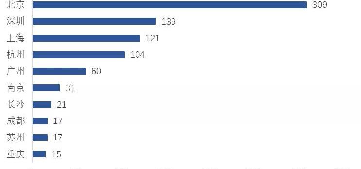 從信息服務備案的區域分布來看,北京、深圳、上海、杭州、廣州等五個一線城市的備案數量遙遙領先,五市備案總數占比超過72%。更進一步,備案數量排名前十的城市占比超過82%。