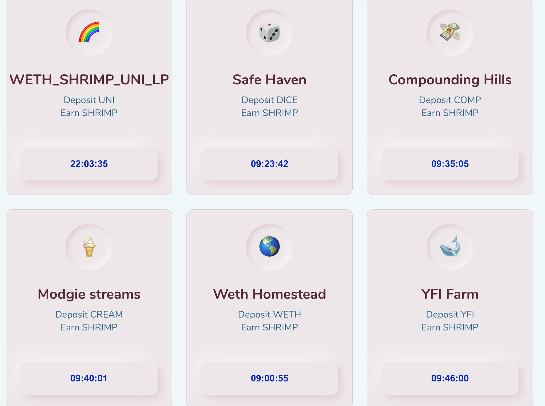 shrimp是一個類似于Yam的farmingpool,不過它選擇的farming對象有些別出心裁,不僅選擇了大標的,一些相對小眾的幣種也可以進行farming,下文提到的taco也新晉成為了shrimpfarmingpool的成員。