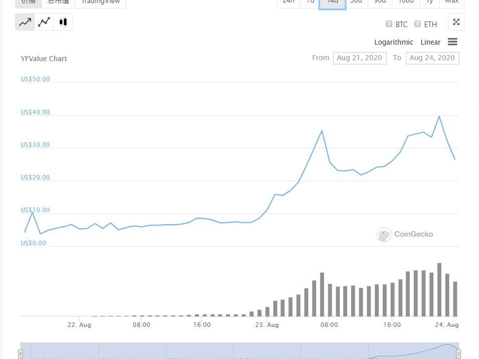 YFV在coingecko上的價格從8月21日開始,最初價格是4.2美元,昨日最高漲到35美元,漲幅將近9倍。