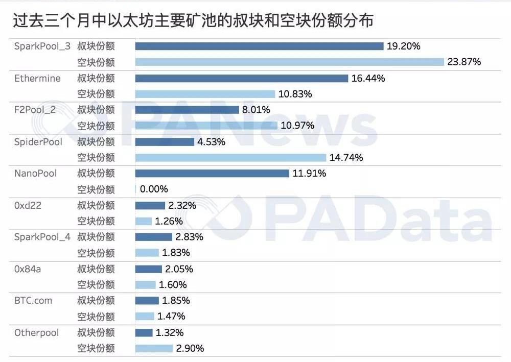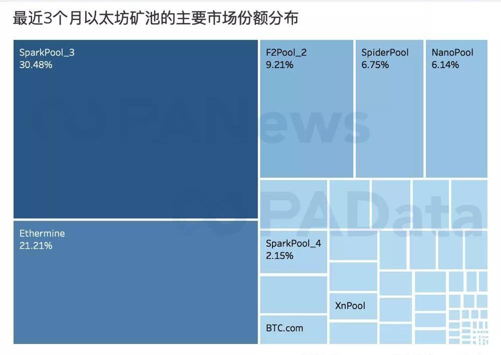 最近3個月以太坊挖礦的算力主要集中于SparkPool和Ethermine兩大礦池,市場份額合計占比51.69%。