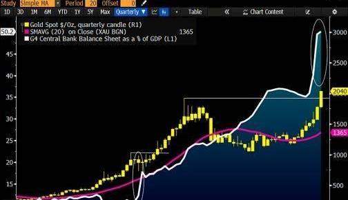 量化寬松政策和金價上漲:金價接近每盎司2000美元,類似于2008-09年,當時1000美元是阻礙,量化寬松政策是主要催化劑。當時的金融危機和央行量化寬松的啟動加速了金價的上漲,這次我們看到了更為持久的相似之處。下圖描述了現貨黃金向每盎司3000美元的潛在漲幅,而在7月24日,金價約為1900美元,如果簡單地按照四國央行資產負債表占GDP的百分比計算的話。從本質上講,央行通過印鈔刺激通脹是基準價值儲備的堅實基礎。