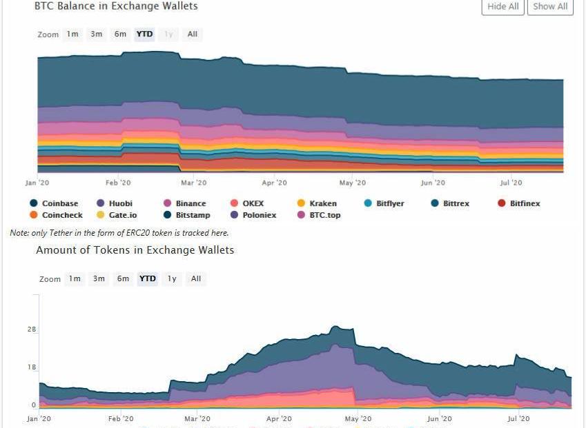 2020年BTC、USDT的交易所錢包余額變化?來源:ViewBase