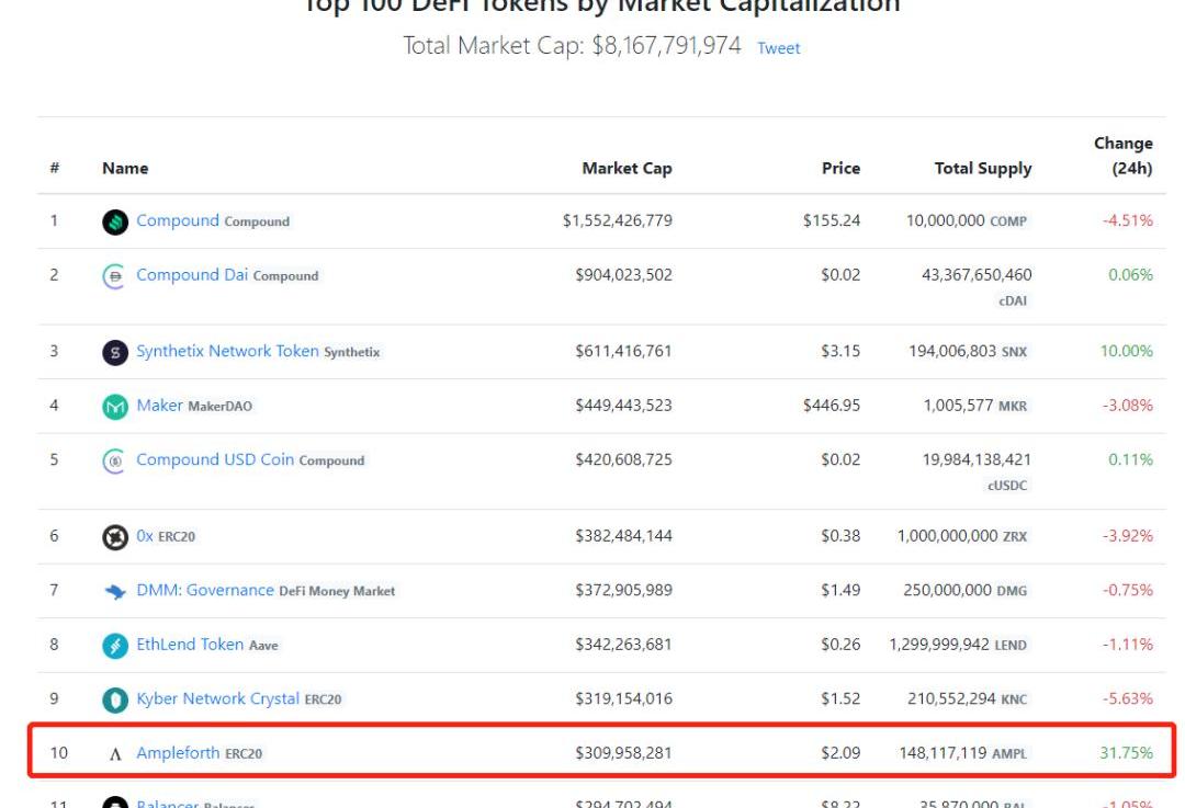而同為去中心化的穩定幣AMPL,2019-06發行,現在市值3.09億美元,在DeFi市值排行中躋身第10。