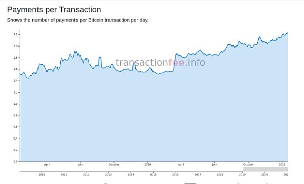 所以,可以看出,比特幣在交易量不變的情況下,處理了更多的支付。單筆交易包含更多的費用,因此產出也更多。這一點也可以用統計數據來證明。