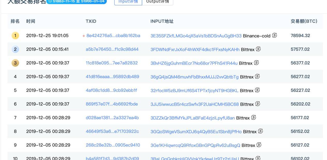 在12月初,主要是北京時間5日和6日,我們可以發現交易額有激增的情況發生,其原因是Bittrex進行了超大額比特幣出幣并切換到新地址的操作,使得這兩天的鏈上交易激增,累積涉及的交易額超過270萬BTC,如果考慮這一因素,從交易額角度看,12月的鏈上活躍度相較11月會有更大幅度下降。從此后Bittrex的操作來看,這一出幣策略還將繼續,所以今后我們還會時常遇到這樣的數據突變。除了Bittrex以外,幣安、Xapo、Coincheck、Bitmex、Bigone也都有萬枚以上的大額BTC發起的交易,但實際轉出量都沒那么大,且頻度有限,對交易額總量的影響相對較小。