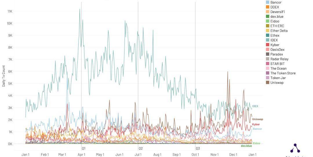 IDEX上的交易數量在第二季度達到峰值(平均每天約7000筆交易),然后在第四季度又回到約3000筆/天。Uniswap、Kyber和Bancor輪流占據以下3個位置,平均日計數在~1k-2k范圍內波動。