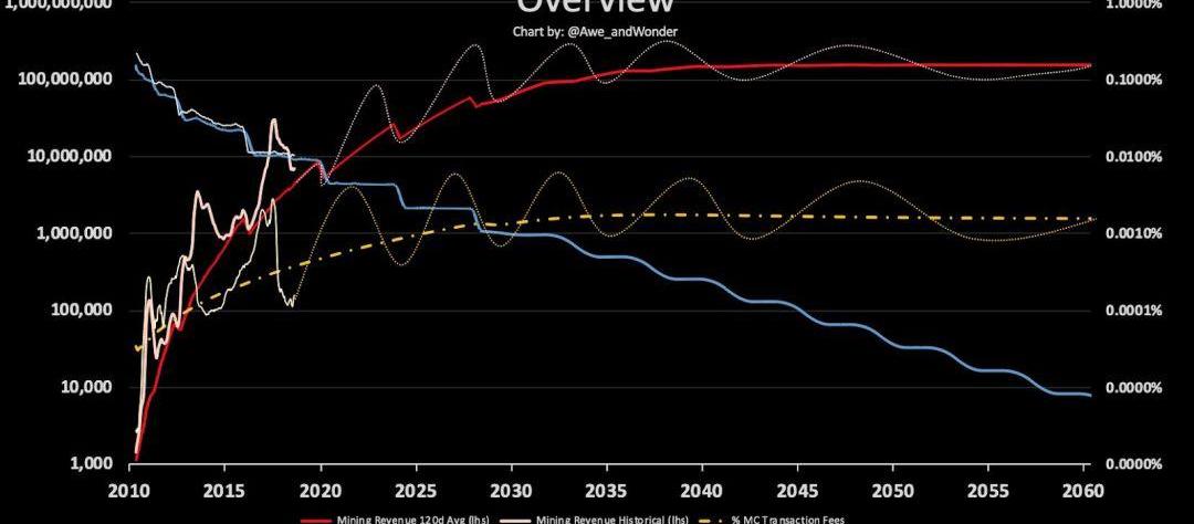 通過Awe和Wonder完成的模型,我們可以看到,2030年左右,交易費將開始始終代表區塊獎勵的一個健康部分。當交易費在長期占區塊獎勵的50%以上時,比特幣將發展到更依靠交易費存活。