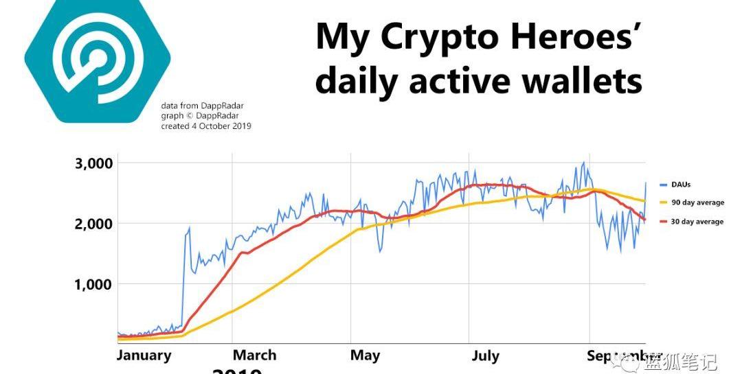 結合最活躍的NFT角色市場之一,結果是MyCryptoHeroes穩步增長至大約3,000DAU,而這只是因為9月份以太坊區塊鏈交易的gas價格上漲而受到抑制。