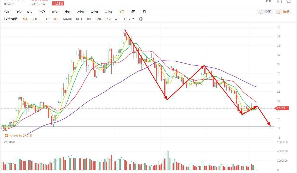 BNB已經連續橫盤多日,整個反彈跟它沒有太大關系,因為它并不屬于抄底品種,市場就是在做超跌反彈,誰跌得多誰反彈的多,關于該標的,觀點并沒有變,還是維持中期調整的看法,在目前的點位抄底盤并不多,資金比較謹慎,本輪的反彈不過是對前期低點24美元被跌破的一個反抽確認,我個人認為該標的在靠近20天線后還將進一步下探尋求支撐,該標的可能會在18美元附近得到有效支撐,如果在18美元出現小幅放量的話,我會考慮小倉位抄底,不構成建議,注意風險。