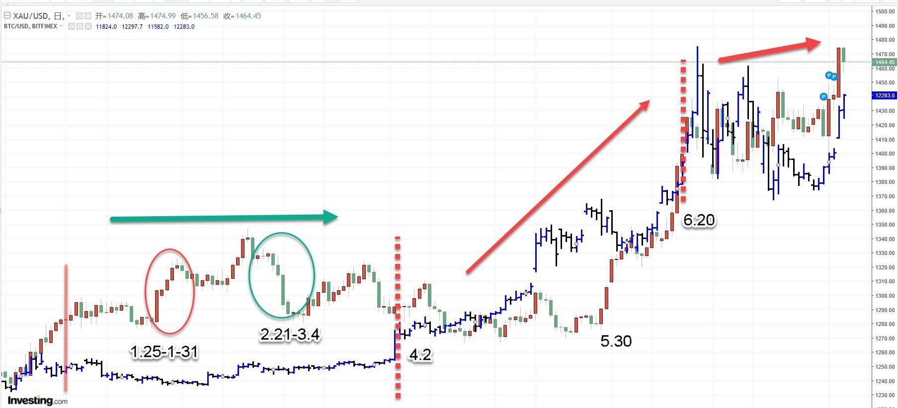 將2019年上半年的黃金和比特幣價格放在一起,可以明顯的看出三個大的階段內,有一些同步之處。